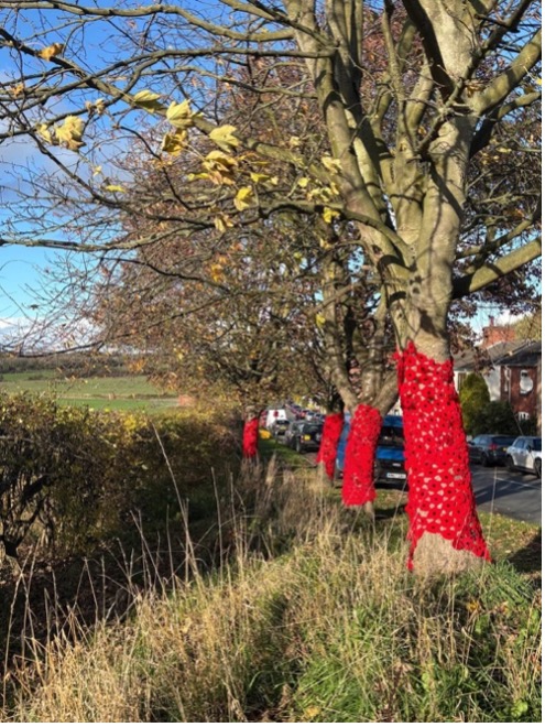 Without having a community centre or building suitable to use, we were determined to place the poppies where they were sure to catch the eye of passersby. Some of the group couldn’t quite visualise what the end result would be while sewing a sea of poppies together on a table, but were all very pleased how they turned out. We had some lovely feedback from residents saying how pleased they were with the display and how stunning they looked.