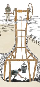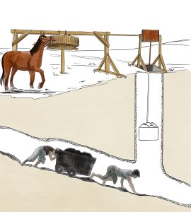 Eventually pits needed to go deeper to find the coal seam and more sophisticated extraction techniques were needed. As the vertical tunnels or shafts became deeper, the sides required wooden shuttering for support. The manual winch for drawing buckets of coal was replaced by a horse gin and then by steam engine.