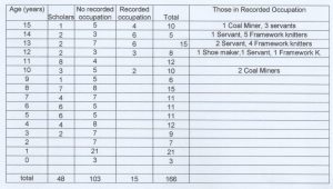 In terms of type of employment it can be seen that there has been a significant decrease in the numbers employed as agricultural labourers, although the number of Farmers has decreased only slightly. The increase in Framework Knitters could be caused by this decrease of employment on the land or the cause of it. Another explanation could be the redefining of some Agricultural labourers as Farm Servants.