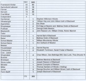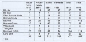 In 1851 no distinction was made between Newton and Newton Green, much as it is today, but later censuses revert to list both. Similarly the distinction between Lane End being Blackwell or Hilcote is uncertain, but a calculated estimate has been made based upon family names in order that a comparison between 1841 and 1851 may be made.