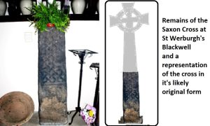 The earliest record of a church on this imposing site, lies in the remains of the Saxon Cross in the entrance porch, and said to date perhaps from about 650 AD. The local population would probably have met with missionary preachers around the cross, leading to the building of a Saxon Church in wood with a straw thatched roof. The Cross has lost it’s cross piece, and the shaft alone remains. It has interlaced spiral knots and Staffordshire knots carvied into it. The Domesday book tells of a priest at Blackwell around 1085.